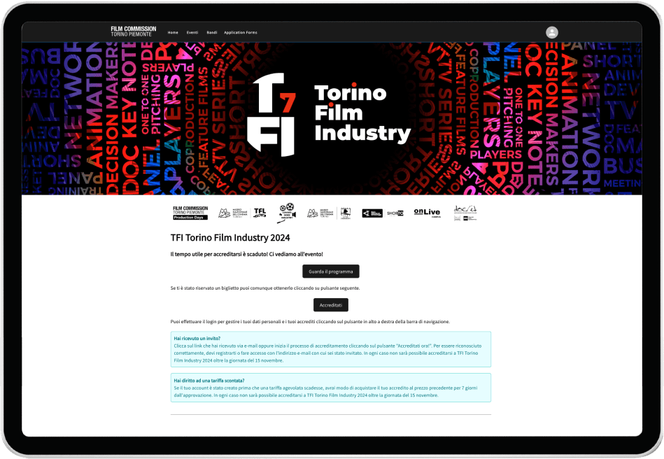 Per rispondere all’esigenza di ottimizzare e digitalizzare i propri processi, la fondazione ha coinvolto il team Technologies di Synesthesia con l’obiettivo di creare una piattaforma unificata. Il sistema consente la gestione centralizzata del censimento degli uffici di produzione, degli accrediti per il Torino Film Festival e dei flussi operativi legati ai bandi promossi dalle diverse entità istituzionali coinvolte.