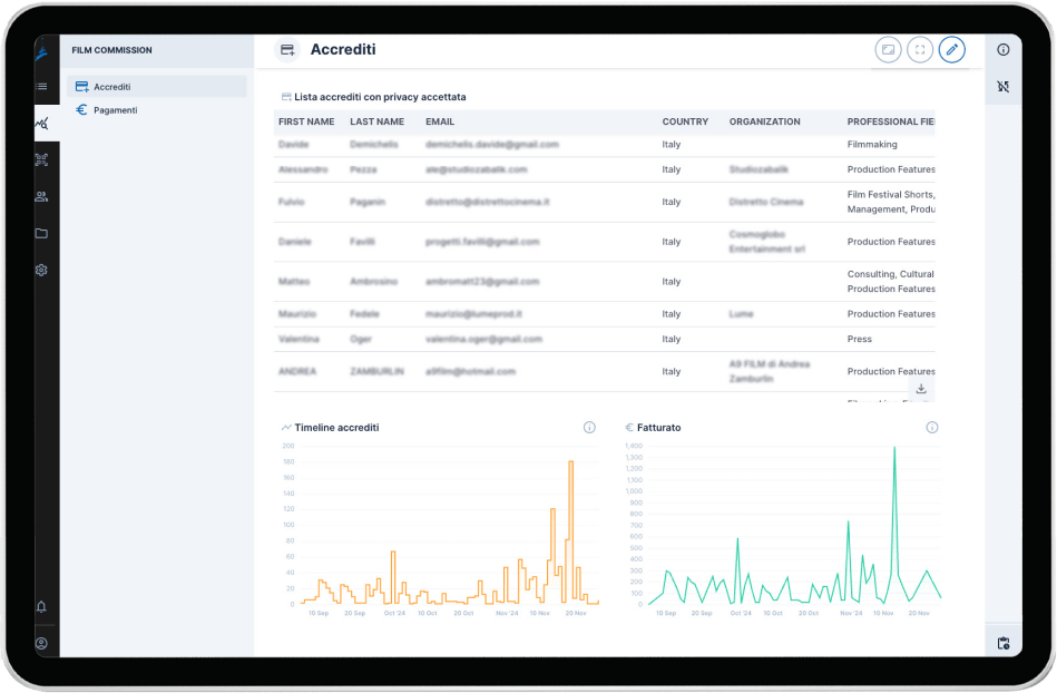 Il sistema consente un’amministrazione efficiente e autonoma delle attività, facilitando le interazioni con le case di produzione attraverso funzionalità avanzate per la gestione degli accessi, degli eventi e dei bandi.
